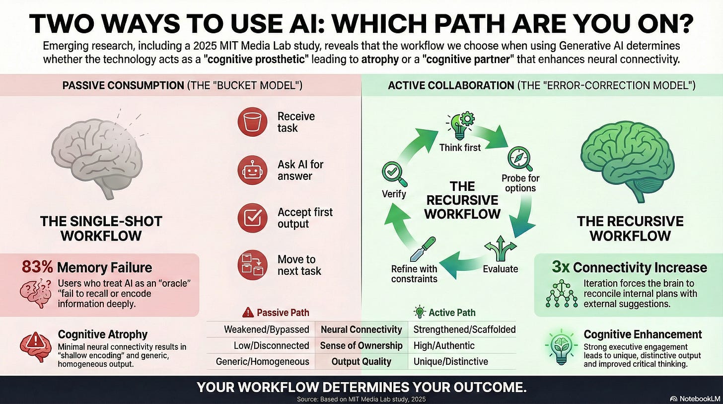 This gap will widen. Every hour spent using AI the wrong way compounds the problem. Every interaction trains your brain either toward engagement or toward passivity.